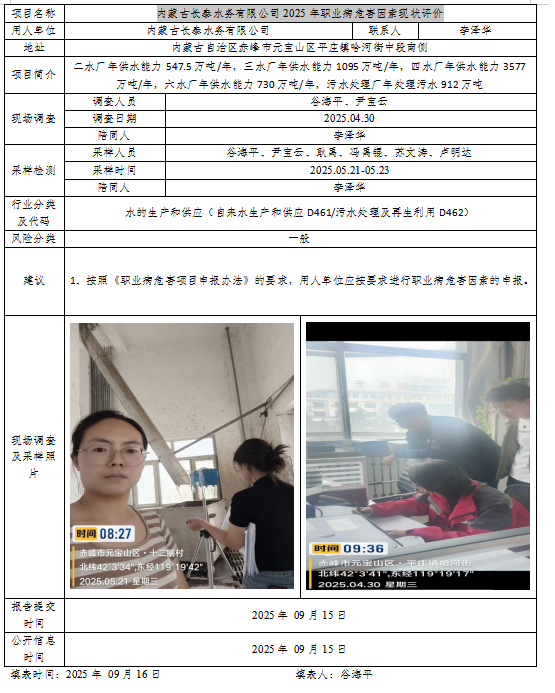 内蒙古长泰水务有限公司2025年职业病危害因素现状评价