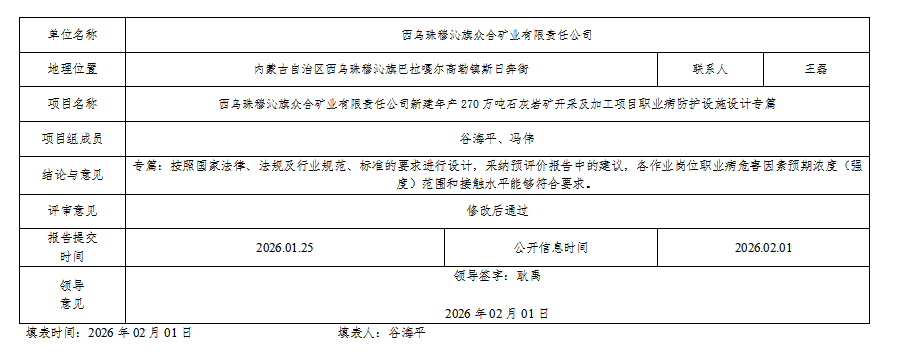 西乌珠穆沁旗众合矿业有限责任公司新建年产270万吨石灰岩矿开采及加工项目职业病危害预评价