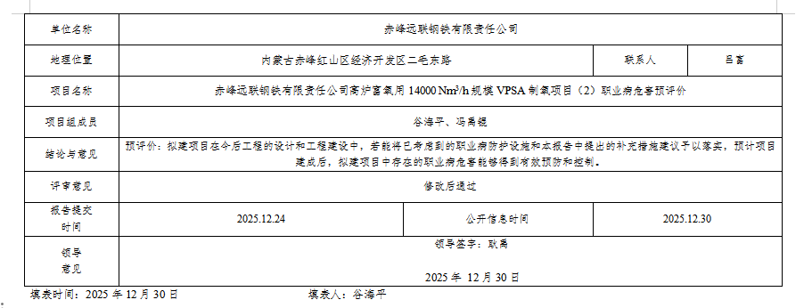 赤峰远联钢铁有限责任公司高炉富氧用14000 Nm3/h规模VPSA制氧项目(2)职业病危害预评价