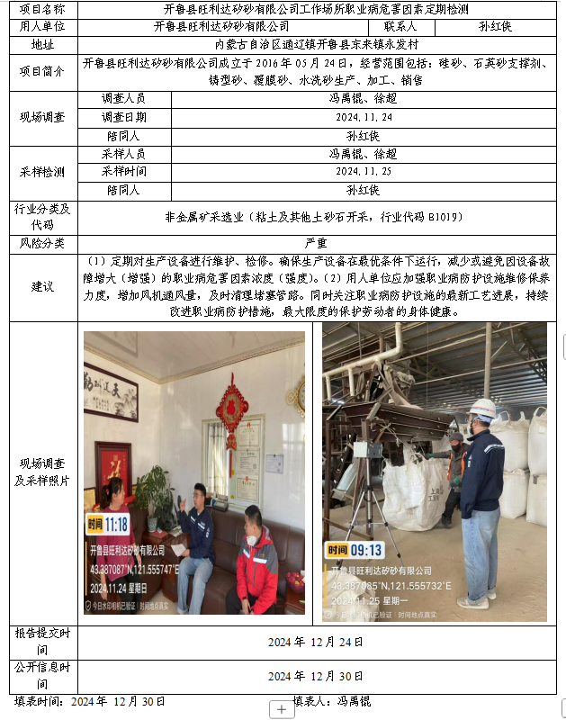 开鲁县旺利达矽砂有限公司工作场所职业病危害因素定期检测2024