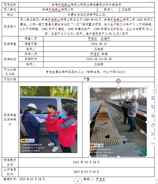 赤峰中色锌业有限公司职业病危害现状评价报告