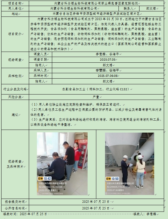 内蒙古科为博生物科技有限公司2025年度职业病危害现状评价2025