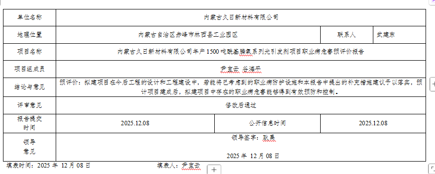 内蒙古久日新材料有限公司年产1500吨酰基膦氧系列光引发剂项目职业病危害预评价报告